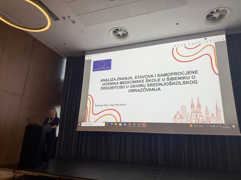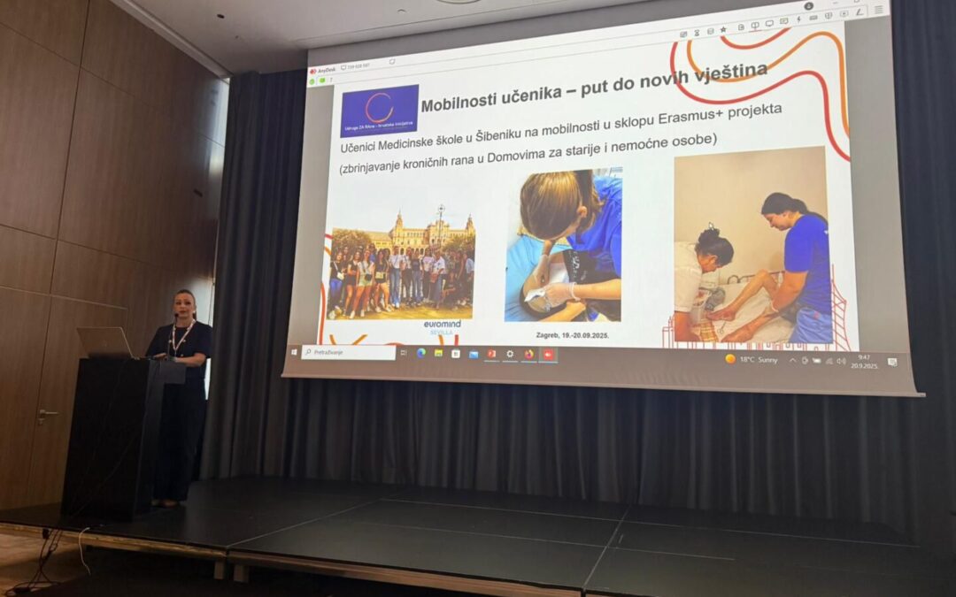 U Zagrebu je 19. i 20. rujna 2025. godine održan 4. međunarodni kongres – Udruga ZA RAne – hrvatska inicijativa „Holistički pristup liječenju rana: Od prevencije do oporavka“ na kojem je nastavnica Antonija Žaja predstavila rezultate provedenog istraživanja „Analiza znanja, stavova i samoprocjene učenika medicinske škole u Šibeniku o dekubitusu u okviru srednjoškolskog obrazovanja“. U sklopu izlaganja istakula je našu školu kao primjer dobre prakse. Poseban naglasak stavljen je na sudjelovanje naše škole u Erasmus+ projektima, kroz koje učenici stječu dragocjeno stručno znanje i vještine u domovima za starije i nemoćne osobe, s posebnim naglaskom na zbrinjavanje kroničnih rana. Uz profesionalne kompetencije, učenici razvijaju i empatiju, odgovornost te osjećaj pripadnosti zdravstvenoj struci. Sudjelovanje na kongresu još je jednom pokazalo važnost međunarodne vidljivosti i razmjene iskustava te doprinijelo prepoznatljvosti naše škole kao ustanove koja svojim radom u Erasmus+ projektima podiže razinu kvalitete obrazovanja i osnažuje učenike za cjeloživotno učenje.